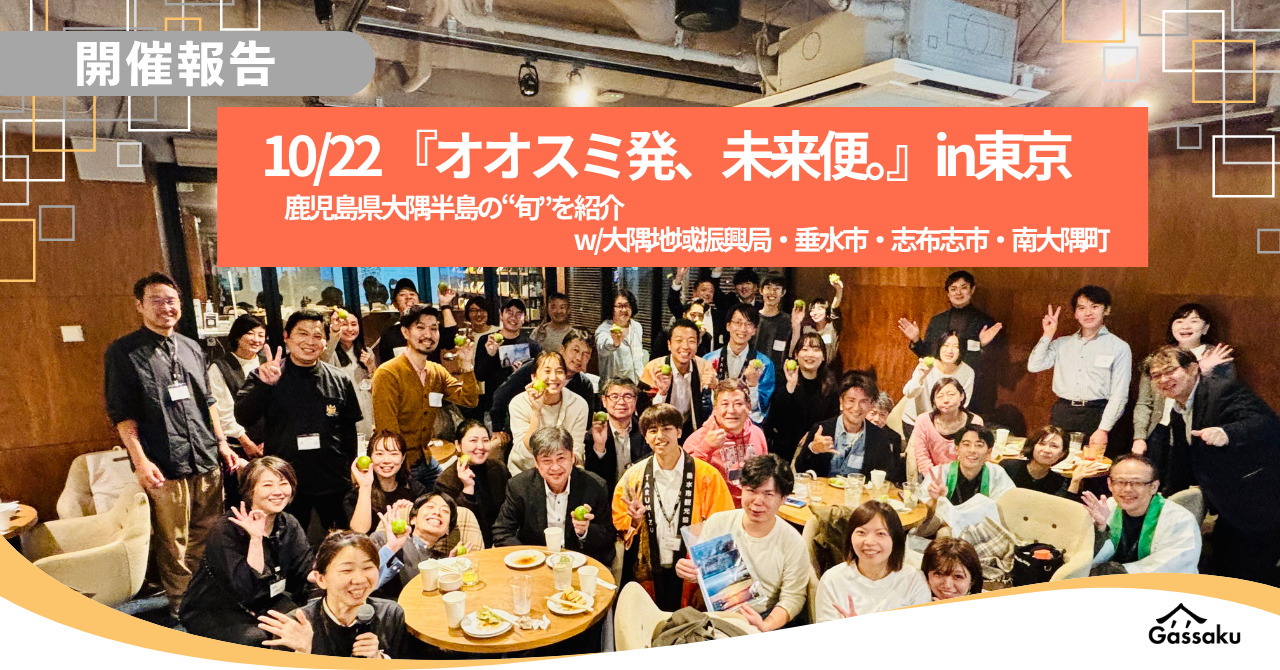 2025年10月22日、都内で鹿児島県大隅地域の町のみなさまと一緒に首都圏在住で鹿児島にゆかりや関心のある方々をお迎えし、大隅の”旬”をテーマにつながりと交流をつくるイベント『オオスミ発、未来便。』〜鹿児島県大隅地域から届く、旬と物語〜を開催しました。