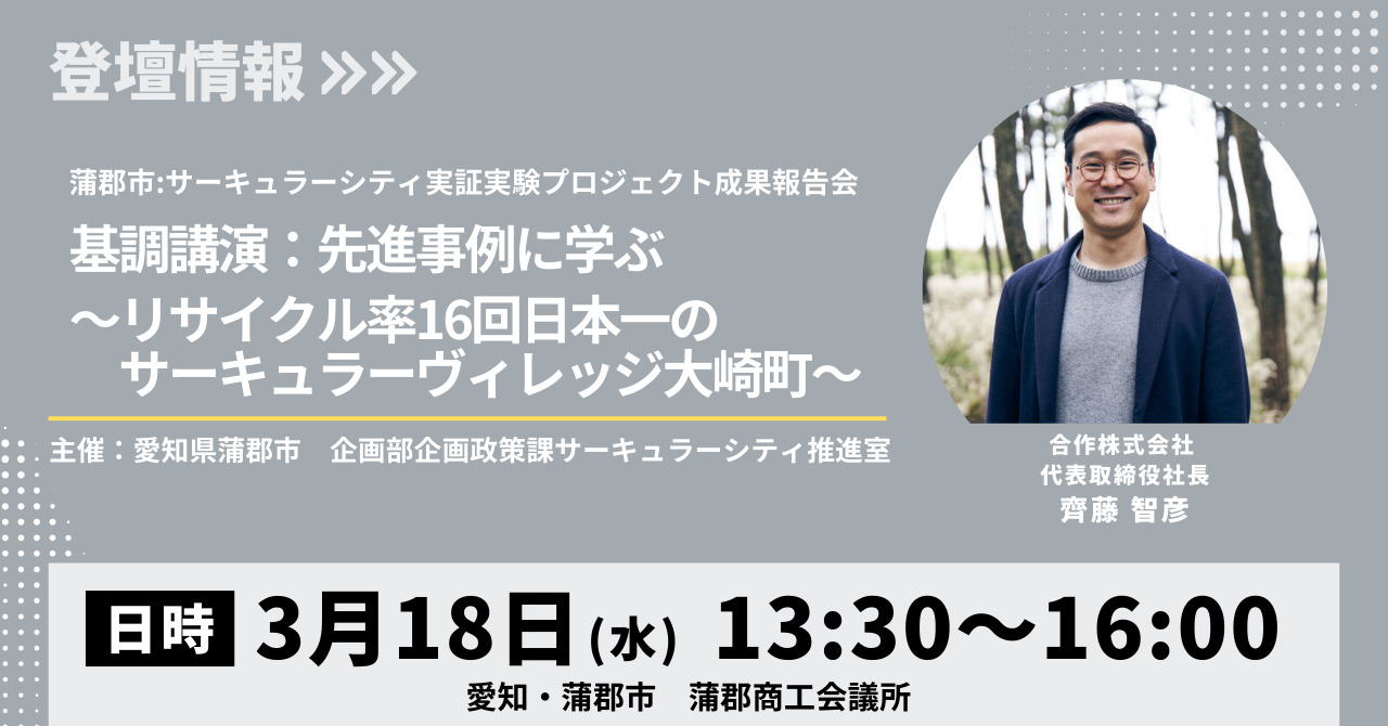 3/18に蒲郡市主催で開催される《サーキュラーシティ実証実験プロジェクト成果報告会》の基調講演に齊藤(代表取締役)が登壇します。