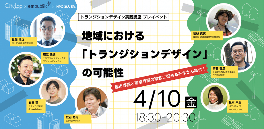 4/10にシティラボ東京(東京/京橋)で開催される《地域における「トランジションデザイン」の可能性〜トランジションデザイン実践講座 プレイベント》に齊藤(代表取締役)が登壇します。